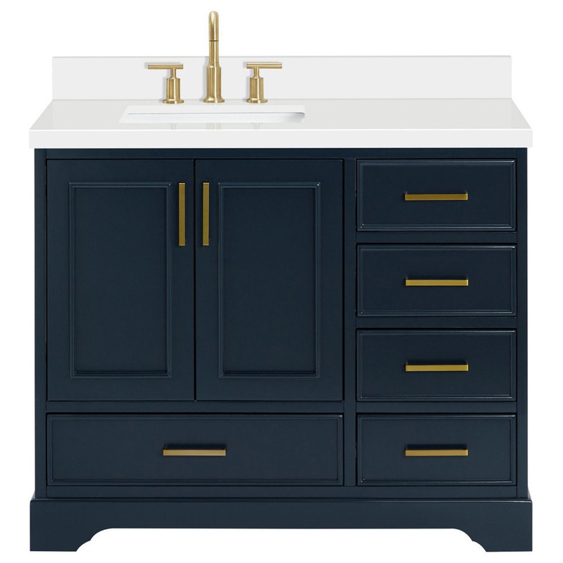 The Stafford 43″ bathroom vanity combines traditional style with elegance, making it an ideal choice for any bathroom space. Hardwood & plywood construction ensures lasting beauty and durability. Ample storage space, including a cabinet and dovetail drawers, ensures functionality. The white quartz countertop adds a touch of sophistication. Complete with satin brass hardware, this stunning vanity is the perfect upgrade for your bathroom.