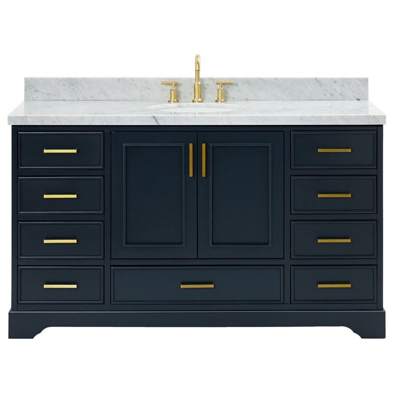 The Stafford 61″ bathroom vanity combines traditional style with elegance, making it an ideal choice for any bathroom space. Hardwood & plywood construction ensures lasting beauty and durability. Ample storage space, including a cabinet and dovetail drawers, ensures functionality. The carrara marble countertop adds a touch of sophistication. Complete with satin brass hardware, this stunning vanity is the perfect upgrade for your bathroom.