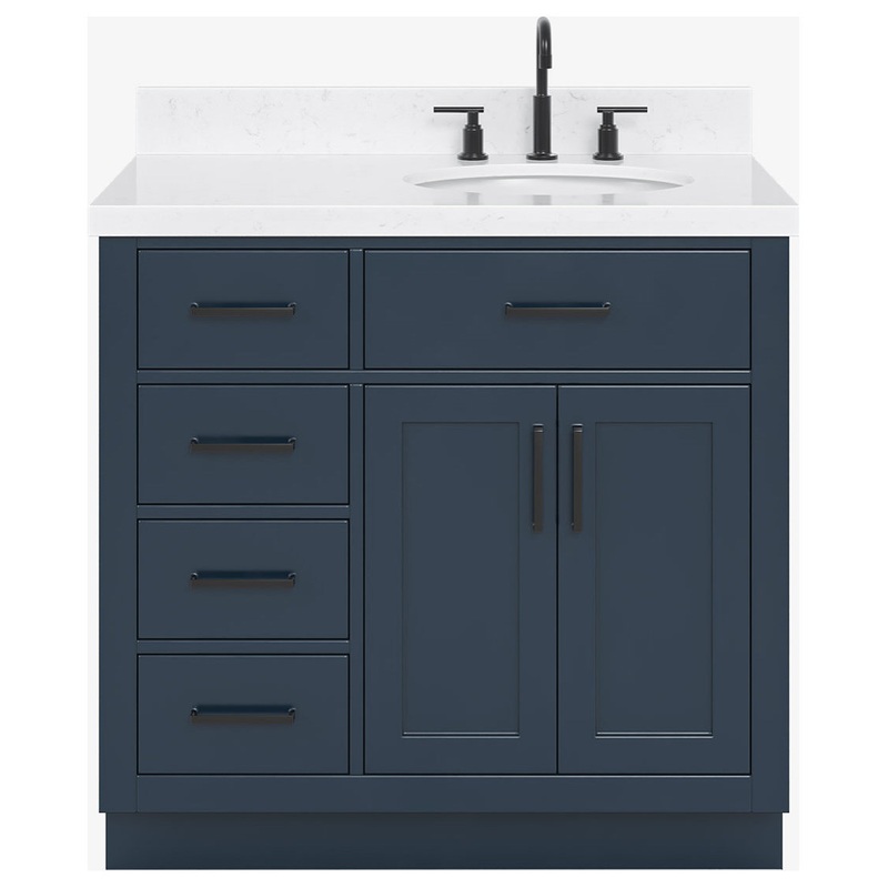 The Hepburn bathroom vanity maximizes all space for optimum storage capacity. Constructed from hardwood frame will be sure to last for many years to come. This vanity is the perfect combination of elegance and form, taking inspiration from traditional cabinetry but with a modern twist. Included Components: Covered under Ariel’s 3 year limited warranty Wood vanity cabinet with 2 doors and 5 drawers Quartz vanity top with a single sink and backsplash Faucet is not included and must be purchased separately Cabinet Features: Constructed from wood providing a lifetime of durability Free standing installation – vanity is seated on the floor with wall anchors, providing a functional design Double door design provides easy access to storage space 4 full extension drawers with soft-close slides and 1 pocket drawer allows for organized storage Soft close drawer slides operate on smooth ball-bearings and prevent drawers from slamming shut Vanity cabinet includes matching decorative hardware Vanity will need to be assembled Vanity Top Features: Quartz vanity top includes a sink 3 pre-drilled faucet holes Each sink features its own oval single basin workspace Center drain location provides optimal draining capability Equipped with an overflow drain to help prevent spillage Vanity top includes matching backsplash Cabinet Specifications: Cabinet Width: 36″ (left to right) Cabinet Height: 34-1/2″ (top to bottom) Cabinet Depth: 21-1/2″ (front to back) Number of Doors: 2 Number of Drawers: 5 Vanity Top Specifications: Vanity Top Width: 35-1/4″ (left edge to right edge) Vanity Top Depth: 22″ (front edge to back edge) Backsplash Height: 4″ Number of Basins: 1 Sink Dimensions: 8″H x 20″W x 16″L Sink Basin Dimensions: 16-1/4″ L x 13″ W x 7″ D Number of Faucet Holes: 3 Faucet Centers: 8″ (distance between the installation holes for the faucet handles)