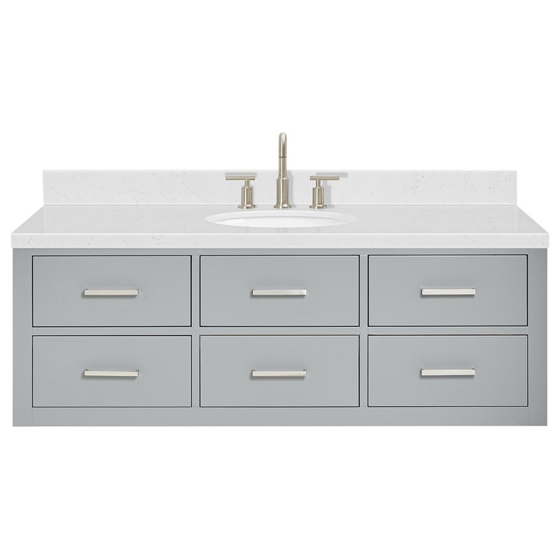 The Hutton vanity built with the finest materials and craftsmanship, hardwood frame, soft-closing drawers, and stylish handles. Hutton is at home in both modern and traditional settings. When youre searching for luxury, look no further than our wall-mount Hutton vanity Included Components: Covered under Ariel’s 3 year limited warranty Wood vanity cabinet with 3 drawers Quartz vanity top with a single sink and backsplash Faucet is not included and must be purchased separately Cabinet Features: Constructed from wood providing a lifetime of durability Wall mounted installation – vanity attaches to the wall creating a floating appearance for a modern look 3 full extension drawers with soft-close slides allows for organized storage Soft close drawer slides operate on smooth ball-bearings and prevent drawers from slamming shut Vanity cabinet includes matching decorative hardware Vanity will need to be assembled Vanity Top Features: Quartz vanity top includes a sink 3 pre-drilled faucet holes Each sink features its own oval single basin workspace Center drain location provides optimal draining capability Equipped with an overflow drain to help prevent spillage Vanity top includes matching backsplash Cabinet Specifications: Cabinet Width: 54″ (left to right) Cabinet Height: 18-1/8″ (top to bottom) Cabinet Depth: 22″ (front to back) Number of Drawers: 3 Vanity Top Specifications: Vanity Top Width: 54-1/4″ (left edge to right edge) Vanity Top Depth: 22″ (front edge to back edge) Backsplash Height: 4″ Number of Basins: 1 Sink Dimensions: 8-1/4″H x 19-5/8″W x 16″L Sink Basin Dimensions: 14-1/8″ L x 17-3/4″ W x 7″ D Number of Faucet Holes: 3 Faucet Centers: 8″ (distance between the installation holes for the faucet handles)