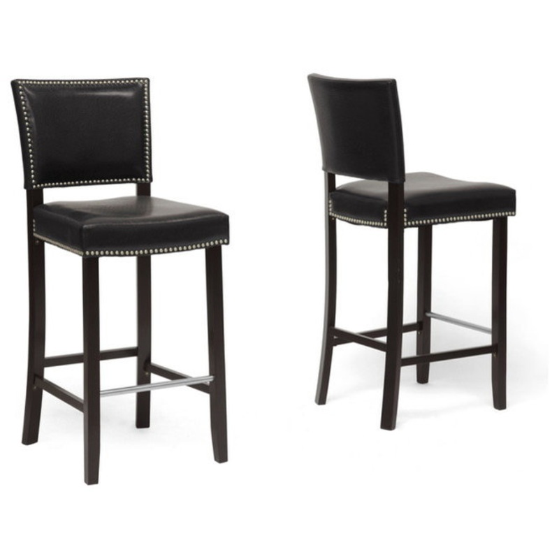 Our Aries Designer Bar Stool looks right at home next to a modern kitchen counter or contemporary bar. Bring this beauty home and you will enjoy sleek black faux leather, a dark brown solid rubber wood frame, convenient stainless steel foot rest, and non-marking feet. Foam cushioning with iron springs offer ample support and comfort. Silver nail head trim completes this Malaysian-made contemporary bar chair. To clean, wipe with a damp cloth. The Aries Stool requires assembly with use of a rubber mallet. Brown and White faux leather options are also available (sold separately). 18.5WX22DX44.5H SEAT:18.5WX18.5DX30.5H