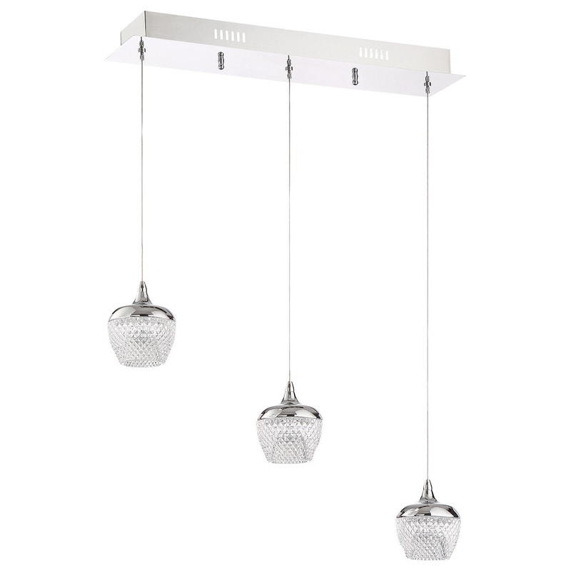 -3-Light LED Pendant Bar in a Chrome finish featuring etched cut glass -OAH: 79" (max. - adjustable) -OAW: 24" -Shade width: 4.5" -Dimmable -5 year warranty -QAI Listed -Bulb Type: Integrated LED -LED info - Watts (W): 15Model # (MPN)PF91-3LBR-CHProduct ID