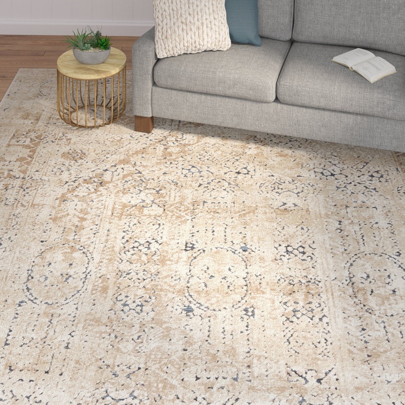 Lay an understated and approachable foundation in any room with this traditional beige area rug. Its silhouette is power-loomed from polypropylene and chenille with a cotton backing. It showcases a distressed Persian-inspired pattern for a dash of vintage inspiration, and it boasts neutral hues that blend in with your existing color palette. Plus, its low 0.25″ pile height works great in high-traffic areas of your home like the kitchen or bathroom. For easy upkeep, just spot-clean this rug as needed. And to keep it in place, we recommend pairing it with a rug pad. Lark Manor Rug Size: Rectangle 5’1″ x 8′