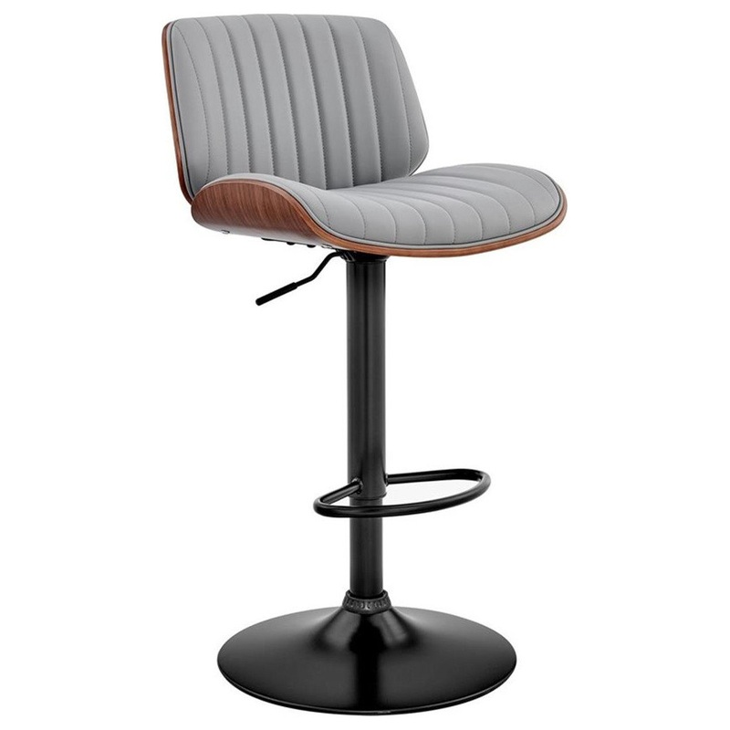 Introduce the beautiful Brock Adjustable Gray Faux Leather and Walnut Wood with Black Finish Bar Stool into your home and allow it to revitalize your home setting! The high-grade faux leather upholstery features a textured-lined seat back, giving the Brock a refined form. The thick, plush foam-padded seating is magnificent on your body and will keep you comfortable and relaxed for as long as youre sitting! The Brock features a 360-degree swivel function for full mobility and an adjustable lift to raise your stool to the perfect height. The Brock is available in your choice of Gray faux leather with walnut wood and a chrome base, Gray or black faux leather with walnut wood and a black base, or Gray faux leather with black wood and a black base.