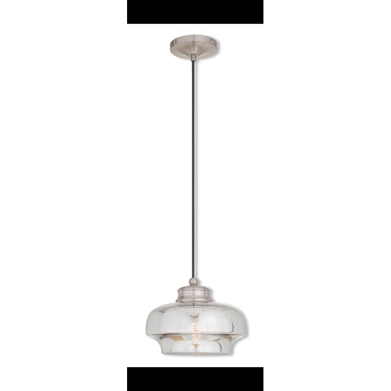 -A glass globe in a modern smoke finish hangs from a matte black cord off a brushed nickel canopy to create this sleek pendant. -Glass Type/Shade Type: Smoke Glass -Finish: Brushed Nickel -Material: Glass -Number of Bulbs: 1 -Bulb Base Type: Medium Base -M