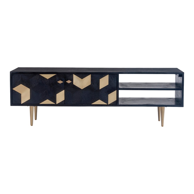 Experience a harmonious blend of modern design and vintage charm with our Artisan Mango Wood & Brass Accent Entertainment Center. This captivating piece features rich mango wood construction, contrasted by bold geometric accents of brass. Its expansive double doors reveal an abundance of storage space for your entertainment devices, while the open shelving unit offers versatile storage solutions. Ideal for creating a striking focal point in any living space, this exceptional TV stand promises to elevate your cinematic experiences.