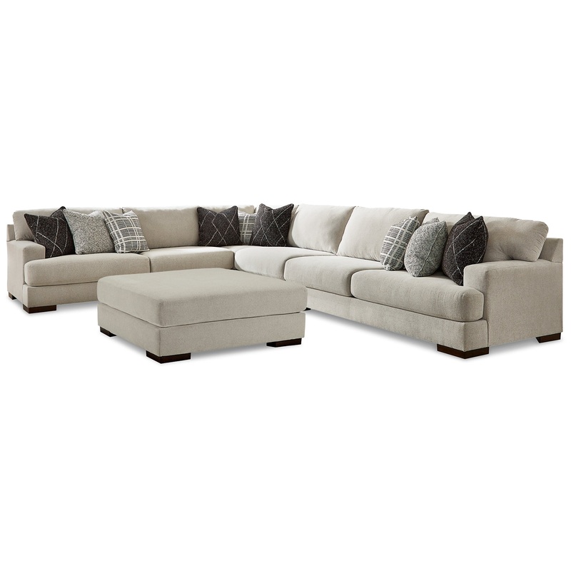 This upholstery package is a beautiful case of oversized spacefully utilized. Its generous scale ensures that everyone has a place to kick back and relax in style. The sets cool color is only part of the story, with a bevy of black and white accent pillows ensuring a happy landing for everyone.