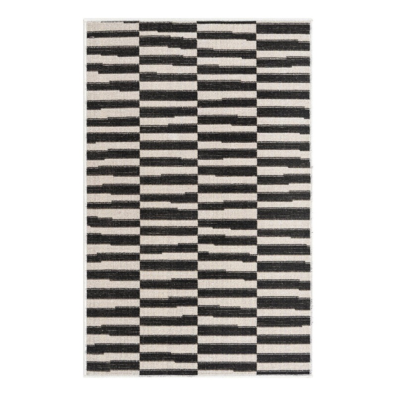 Anchor your room in a bold, contemporary style with this modern area rug. Taking inspiration from classic stripe patterns, it shows off a geometric design with wide vertical stacks on staggered stripes. We love that its neutral black and ivory hues make it