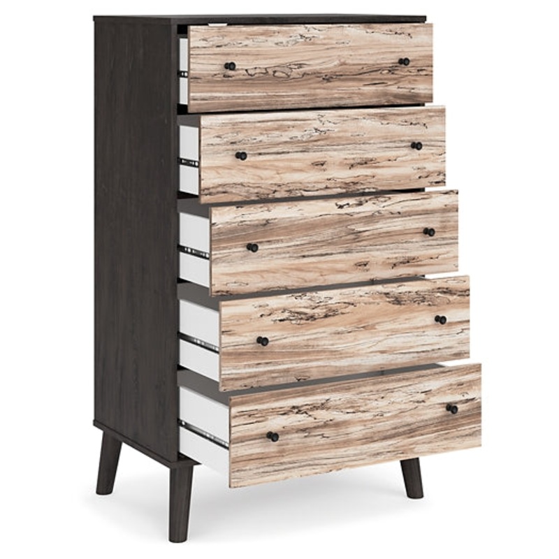 The perfect marriage of simple and contemporary style, this chest of drawers is a charming addition to your home. It features an expressive two-tone look, with a dark charcoal finish over replicated oak grain with an authentic touch and a replicated sugarberry wood grain. Ball-bearing glides offer smooth opening and closing of the drawers, while matte black knobs and splay legs add a finishing touch.