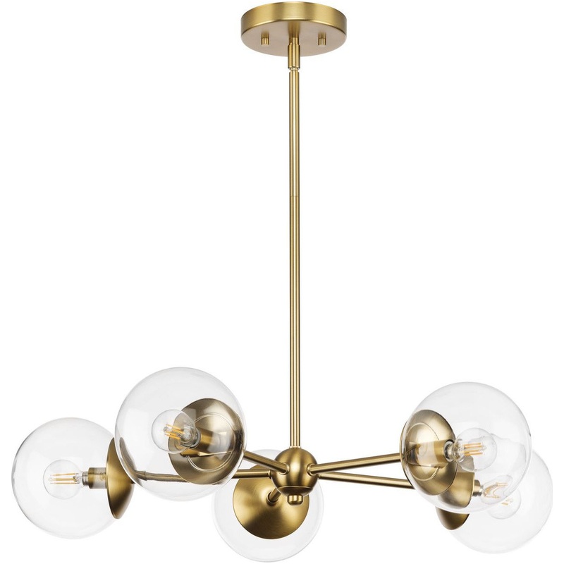 Long lines ending in clear glass globe shades define the modern aesthetic of the Atwell Chandelier. One central stem is capped by clear glass, creating bright illumination from the light source glowing within. Atwell fits beautifully into mid-century modern and contemporary settings, delivering ambient illumination to foyers, dining rooms and living rooms.