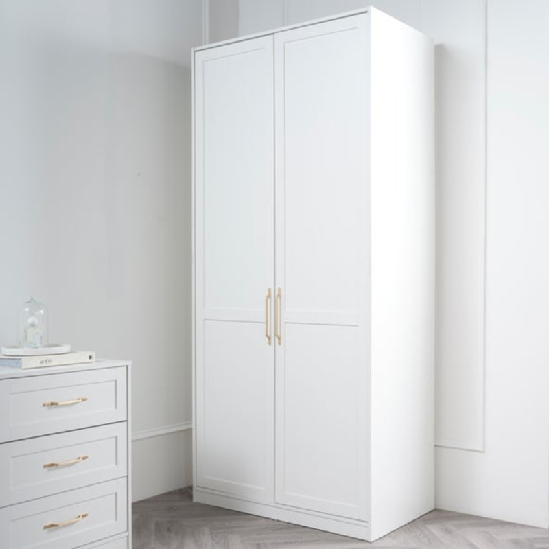 Double wardrobeWhite finishExtra tallModularBrushed brass handlesShaker styleMatching items availableStore your clothes in style with this Shaker design double wardrobe. With plenty of space for all your items, the sturdy wooden construction and brushed br