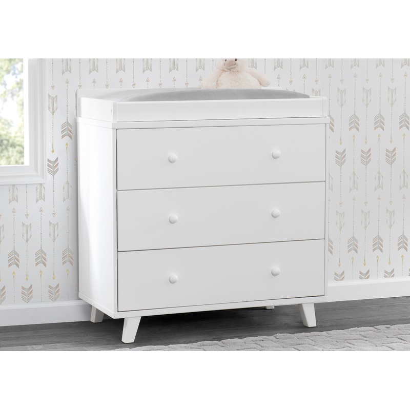 A modern heirloom, the Ava 3 Drawer Dresser with Changing Top and Interlocking Drawers by Delta Children features clean, crisp lines and three spacious drawers with plenty of storage for your growing baby. Topped with a removable changing top, the dresser does double duty–once your baby outgrows the need for a changing table, just remove the topper for many additional years of use. Outfitted with an interlocking drawer system that limits the number of drawers that can be opened at one time for your childs safety, this dresser is the best option for your little one. Plus, its legs match Delta Childrens Ava 3-in-1 Convertible Crib, pair them together to create a cohesive nursery, or mix it with furniture in the same finish or contrasting finish for a more eclectic look. Plus, its GREENGUARD Gold Certified, which means its built to contribute to cleaner air for a healthy home.This Delta Children dresser is tested to meet the current requirements of ASTM F2057, the mandatory CPSC safety standard that protects young children from furniture tip-over incidents. For your childrens safety, only purchase dressers that comply with this standard. For additional security, Delta Children strongly recommends that all dressers in your home be anchored; all Delta dressers include a wall anchor. To learn how to properly secure your dresser, please see the product assembly instructions or visit our website.