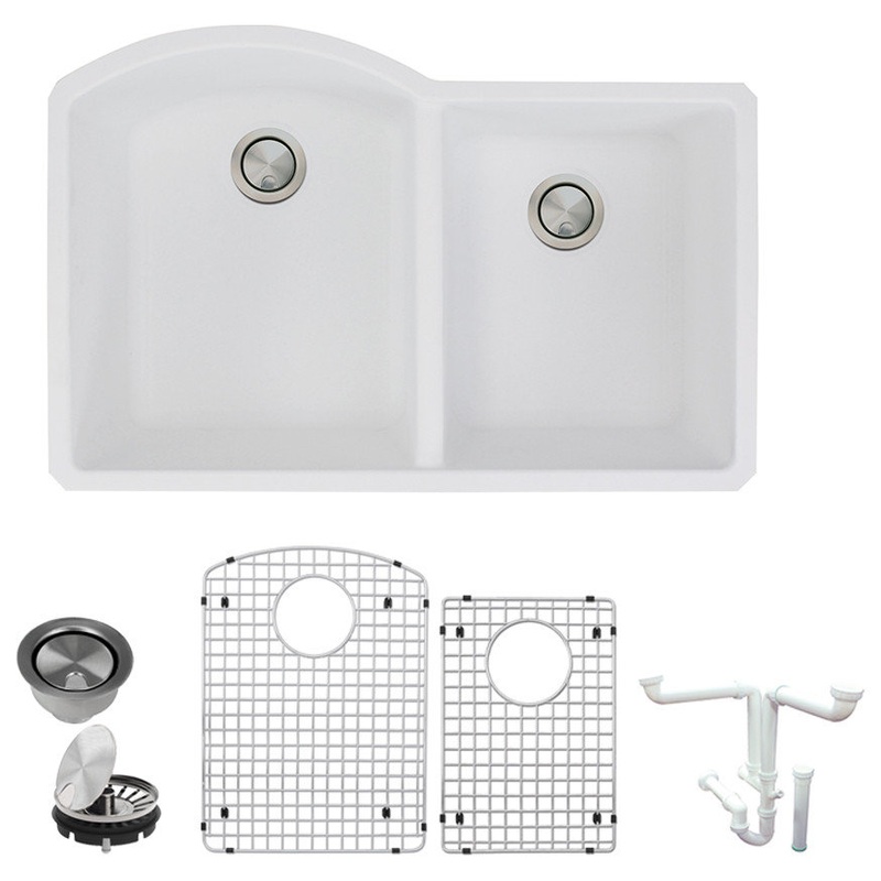 KIT INCLUDES: Granite double bowl kitchen sink, grids, flip-top strainer in Brushed Stainless, flip-top disposer strainer in Brushed Stainless, universal drain installation kit