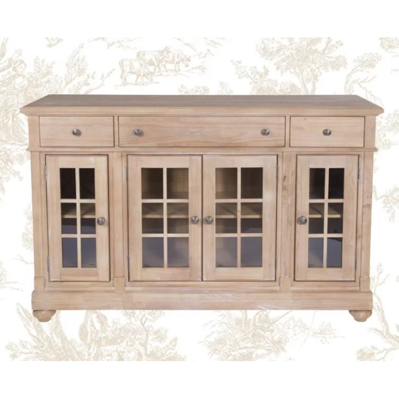 Far from just a dining room focal point, sideboards offer a convenient spot to serve charcuterie spreads, store fine china, and much more. Crafted from solid and engineered wood, this traditional buffet showcases four glass doors with two shelves behind each, perfect for showcasing your favorite dishware and storing tablecloths. Three drawers offer plenty of space to tuck away any loose items you dont want on display, while its spacious 66” W top provides a spacious stage for some decorative trinkets, framed photos, or a vase of your favorite flowers. Hand-curated by Kelly Clarkson.FeaturesFull Extension Metal Side Drawer GlidesFrench & English Dovetail ConstructionFelt Lined Top DrawersAdjustable Shelf Behind Each DoorCasual Cottage Styling w/ Distressed FinishAntique Pewter Knob HardwareThe bun feet and support leg are stored below the bottom panel of buffet for easy set up- See Attached Assembly InstructionsProduct DetailsCountertop Material: Manufactured WoodAdult Assembly Required: YesMain MaterialMain Material: Solid + Manufactured WoodMaterial Details: Poplar Solid and Mindy VeneerDrawers IncludedNumber of Drawers: 3Shelves IncludedNumber of Interior Shelves: 2Adjustable Shelves: Yes