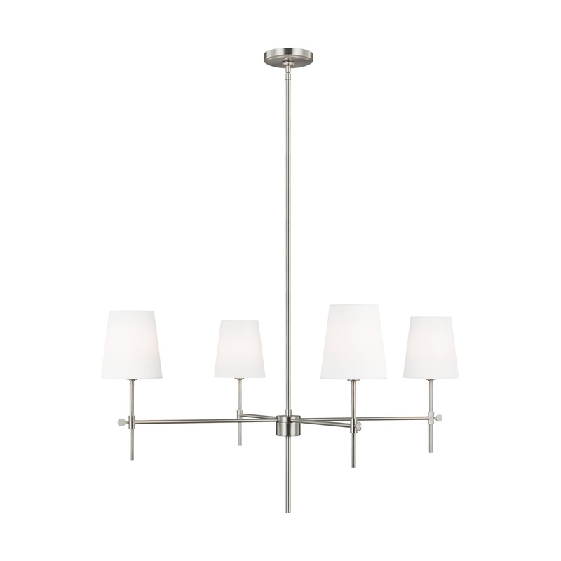 The Baker four light single tier chandelier in Midnight Black introduces transitional-inspired design to your living room or dining room. It’s made from metal and features a round body with arms that support sleek torchieres. Round finials and faux candle holders complete the look with a hint of traditional appeal. White linen fabric shades cap the design and diffuse the light from 60W candle bulbs (not included). Available in three finishes