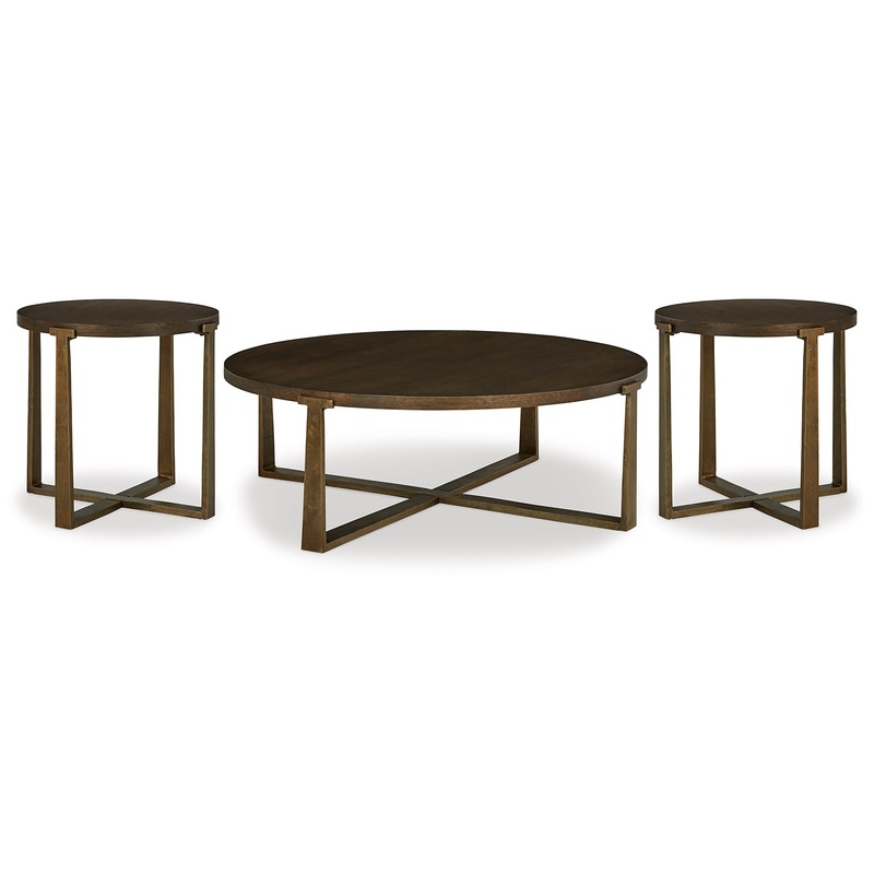Chic and sleek, this coffee table satisfies your taste for contemporary design. Its warm brown top is neutral and refined, while the antiqued goldtone base adds textural character. Place your favorite decorative accents on top to transform your living room into a curated modern masterpiece. 2 Matching end tables included.