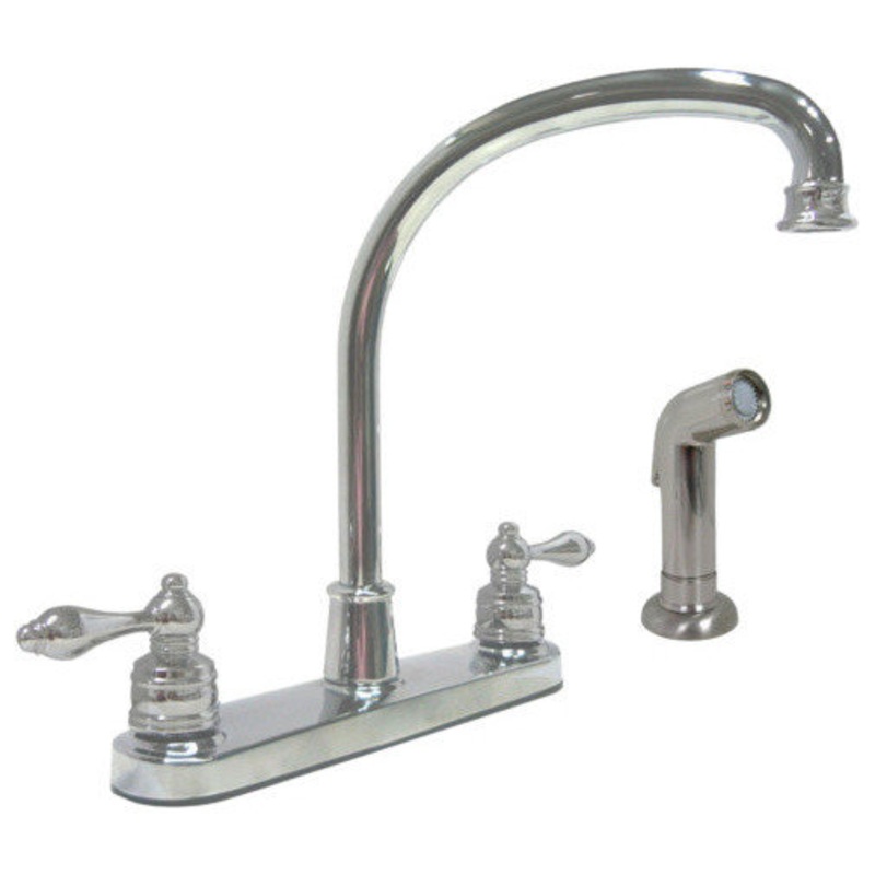 Two Matching Lever Handles, "J" Spout Kitchen Faucet in a Traditional Style with a Matching Side Spray. 8" Centerset with Ceramic Disc Cartridges and All Brass Construction. Model # (MPN)761-SBProduct ID109848289Manufactured ByBanner FaucetsSold ByHouzzSiz