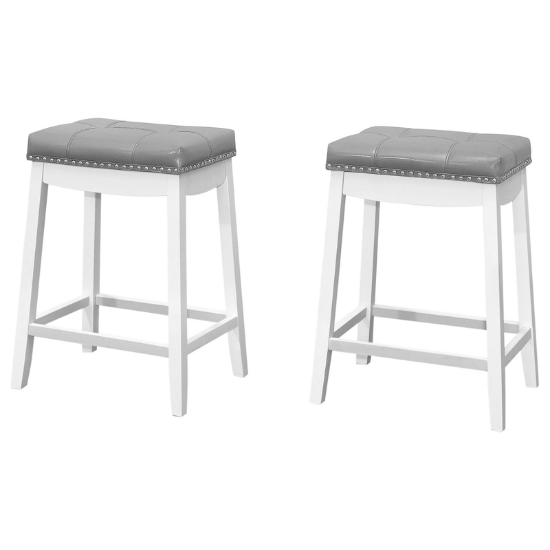 Traditional design details give these barstools a timeless style. Upholstered in a grey leather-look fabric, the rectangular seats feature thick cushions with biscuit tufting that enhances the soft feel of the padding. Nailhead trim in a silver finish around the seats and curved aprons underneath further add to the classic, pub-like appeal of these counter-height chairs. Solid wood legs provide stability and are in a crisp, white finish, while footrests are ideally positioned to relax your feet. Sold as a set of 2, these stools have a space-saving, backless design that allows them to be tucked neatly underneath a kitchen island countertop or counter-height table when not in use.