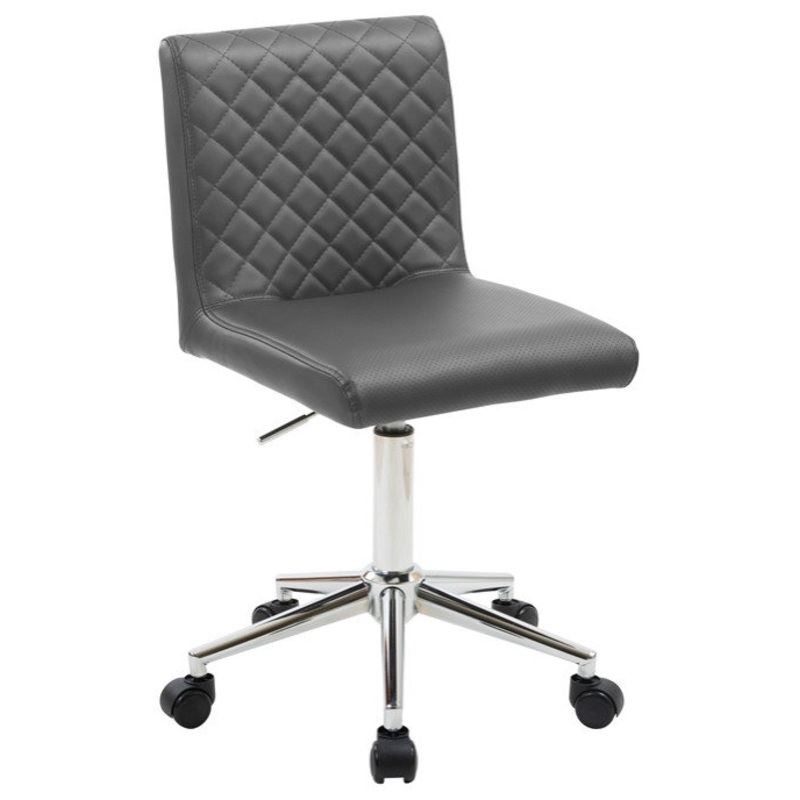 Add this modern, simplistic gray faux leather task chair to your daily responsibilities. Perfect for work or at home, this chair features a swivel mechanism, adjustable height and caster wheels for user accessibility. Faux leather upholstery filled with fo