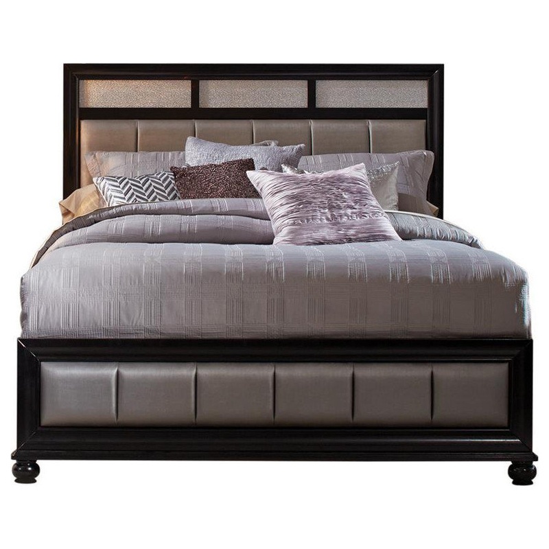 An eye-catching design with sleek style. Make any room a decor haven with this exceptional bed. Easy elegance offers a casual look with modern accents. Bold styling plays with geometric shapes in vertical and horizontal orientations. Add a glam touch with metallic leatherette upholstery.