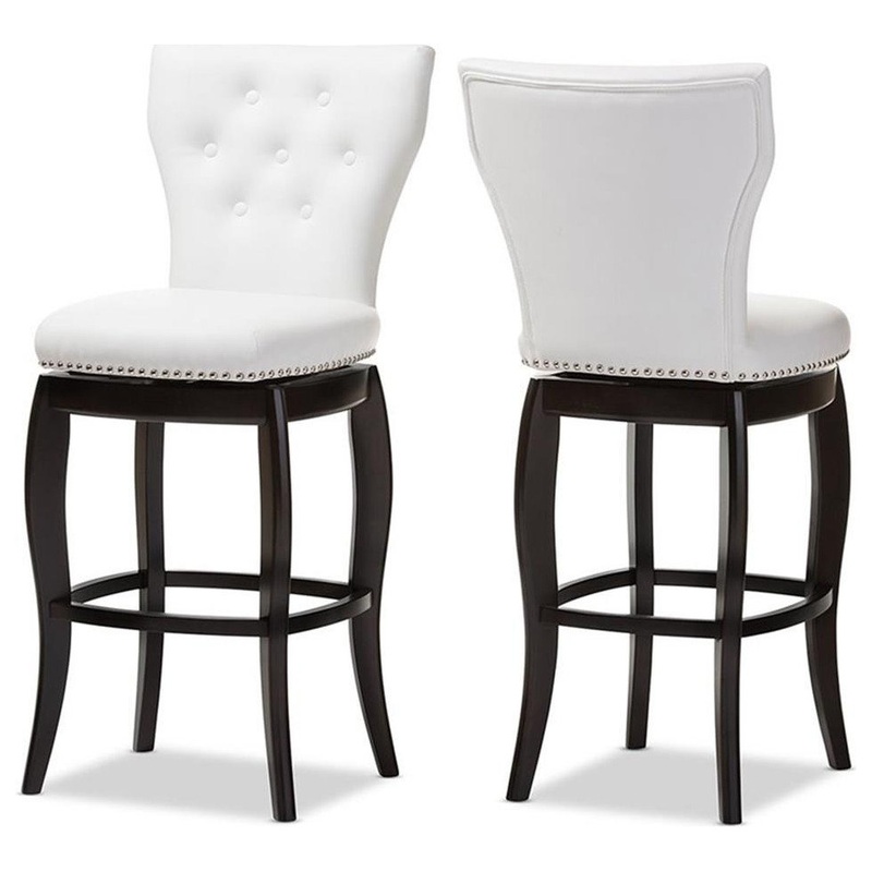 Atop swivel base with flared legs, the Leonice swivel bar stool is both bold and classic. The silver nailheads trim around the seat complements the cut-out backrest in chic style while button-tufting design pulls glamour up to your bar counter. Constructed of solid rubberwood legs, the Leonice swivel bar stool is finished in dark espresso for a contemporary look. To add more comforts, the seat is fully padded and upholstered in white faux leather. For sturdiness, wood stretchers are added to serve as footrest and support. Featuring modern and contemporary in style, the graceful lines of the Leonice and the sleek design make this bar stool a timeless piece for your bar and dining area.