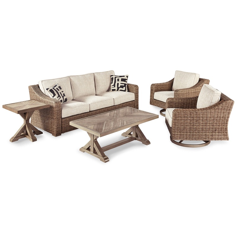 Sporting an easy-on-the-eyes look inspired by driftwood, this outdoor furniture set elevates the art of alfresco living. Beautiful and durable enough for indoor and outdoor use, this high-style/low-maintenance ensemble entices with plush, removable cushions wrapped in Nuvella fabric thats a breeze to keep clean. Sporting X-leg farmhouse styling and thick porcelain tops, the handy tables are a natural complement to the sumptuous sofa and pair of head turning swivel chairs.
