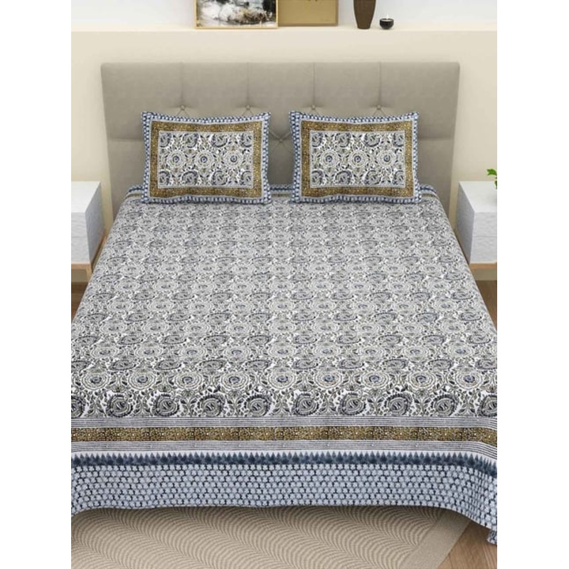 BELLA CASA Ethnic Floral Blue 180 TC Cotton King Bedsheet with 2 Pillow Covers