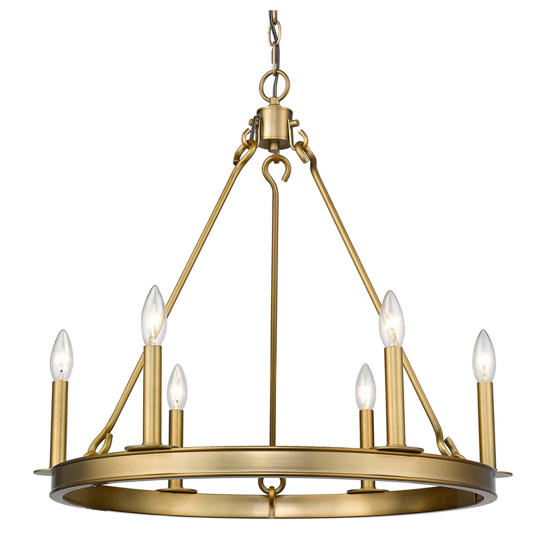Features Constructed of steel (6) 60 watt maximum candelabra (E12) bulbs required Dimmable with compatible dimming bulbs 72″ of adjustable chain included UL, CUL, and ETL rated for dry locations Dimensions Fixture Height: 24″ Width: 25″ Depth: 25″ Product Weight: 43.66 lbs Chain Length: 72″ Wire Length: 110″ Electrical Specifications Number of Bulbs: 6 Max Watts Per Bulb: 60 watts Bulb Base: Candelabra (E12) Bulbs Included: No
