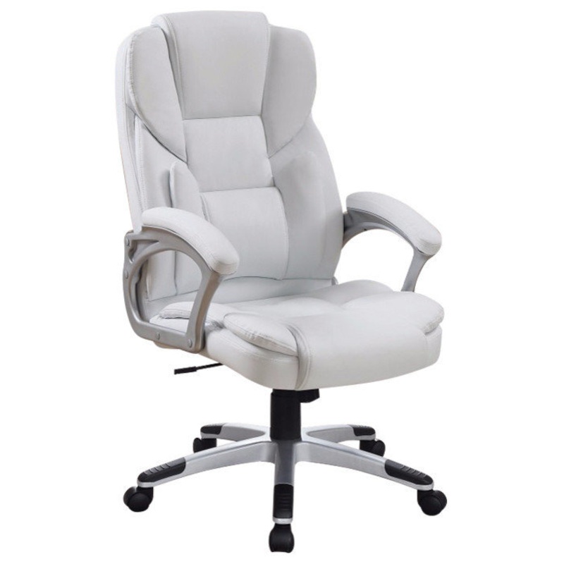 Get the comfort needed to perform all work tasks in this stylish White Contemporary Executive High-Back Leatherette Chair, fitted with ergonomic side bolsters for added support. This chair has lumbar support for optimal back positioning and integrated cush