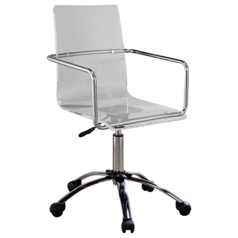 This simplistic Modern Design Transparent Acrylic Adjustable Office Chair will instantly change the look of your room and add style and poise. The Chair features a clear acrylic Seat and Back with a chrome base and armrest. The swivel mechanism allows the