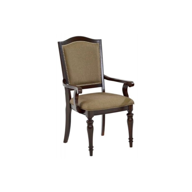 Exquisite traditional style arm chair is very beautiful and elegant in looks and great at comfort. The solid wooden frame in brown finish has been upholstered in light shade fabric creating a contrasting effect. The chair has nail head accents on the back support and lovely turned legs. You can accord it with smart dining table for a complete look.