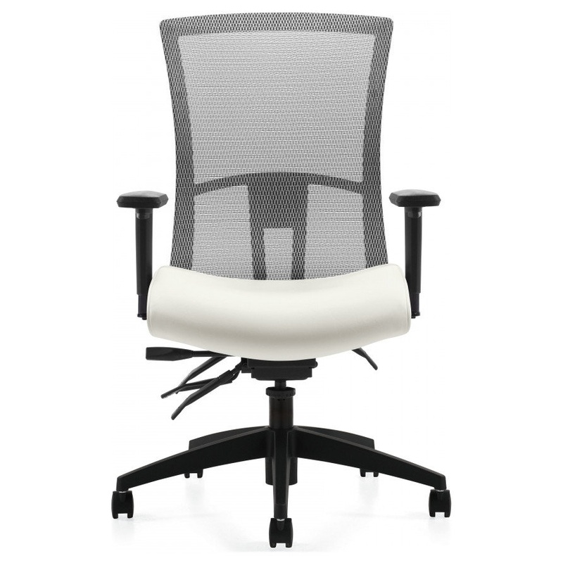 -This high back mesh office chair is available with Light/Natural mesh back, white soft vinyl upholstery and a black frame.