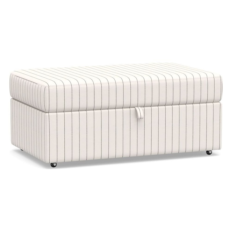 The ultimate sidekick to our Big Sur Collection, this all-in-one ottoman acts as extra seating or a comfy footrest, then opens to reveal a pull-out table with an interior storage space. Stash board games and blankets, set out snacks for movie night, or quickly convert your living room into a home office: The options are endless.ConstructionOttoman features interior storage and a pull-out table.Cushions is semi-attached.Table has locking mechanism.Crafted in America by our own master craftsman. American and imported materials.ComfortDown-blend-wrapped cushions for a softer feel.