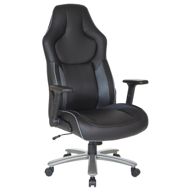 Push your gaming experience to new heights with the Big & Tall Gaming Chair, designed for hours of focused comfort. Stay in the game with fully padded flip arms, thick padded contoured leather seat and back with built-in lumbar support. Level up with the added edge of quick one-touch pneumatic seat adjustments and locking tilt control with adjustable tilt tension. Contrasting color accents provide a visual excitement that will escalate your gaming experience. The 5-star metal base and heavy duty, dual wheel casters move effortlessly and are designed to standup against dirt and scuffs.