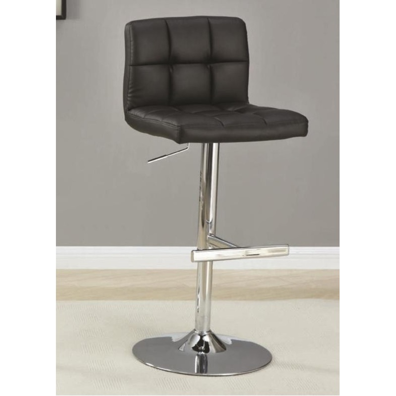 Add this simple, modern bar stool to your pub table or bar for a distinct contemporary style. Seat cushion and backrest are upholstered in a black, durable leather-like vinyl for long-lasting appeal. Underneath the seat is a lever, allowing chair to extend