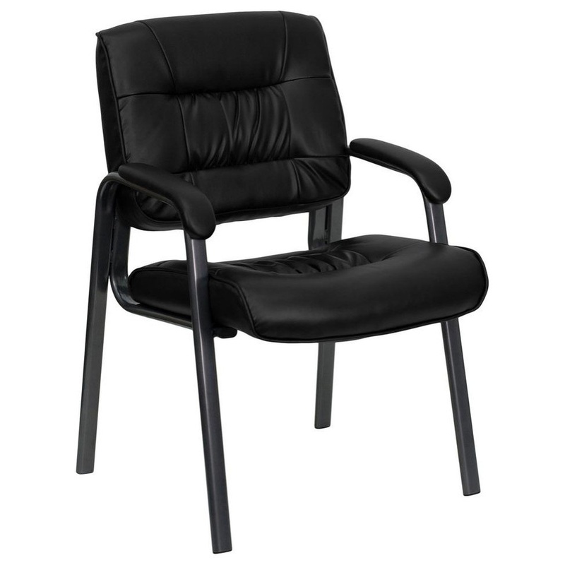 Make a great first impression when your customers or clients visit your place of business with this Black LeatherSoft Executive Side Reception Chair with Titanium Gray Metal Frame. It features a comfortable, contoured tufted seat and back that are padded with 2 of CAL 117 fire retardant foam. LeatherSoft is leather and polyurethane for added Softness and Durability. A waterfall edge seat helps to reduce pressure and promote healthy blood flow to your legs while the padded armrests take the pressure off the neck, shoulders and arms allowing your guests to feel more comfortable. The sturdy metal frame will stand up to heavy use and plastic floor glides protect your floor by sliding smoothly when you need to move it. The sleek modern side chair offers a professional appearance for your reception area, desk or conference table.