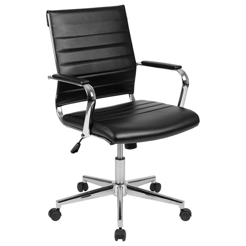-Modern Executive Office Chair -Black LeatherSoft Upholstery -Mid-Back Design with Coat Hanger Bar on Back -Padded Seat with CAL 117 Fire Retardant Foam -Padded Chrome Metal Arms provide support to upper body -Tilt Lock Mechanism rocks/tilts the chair and
