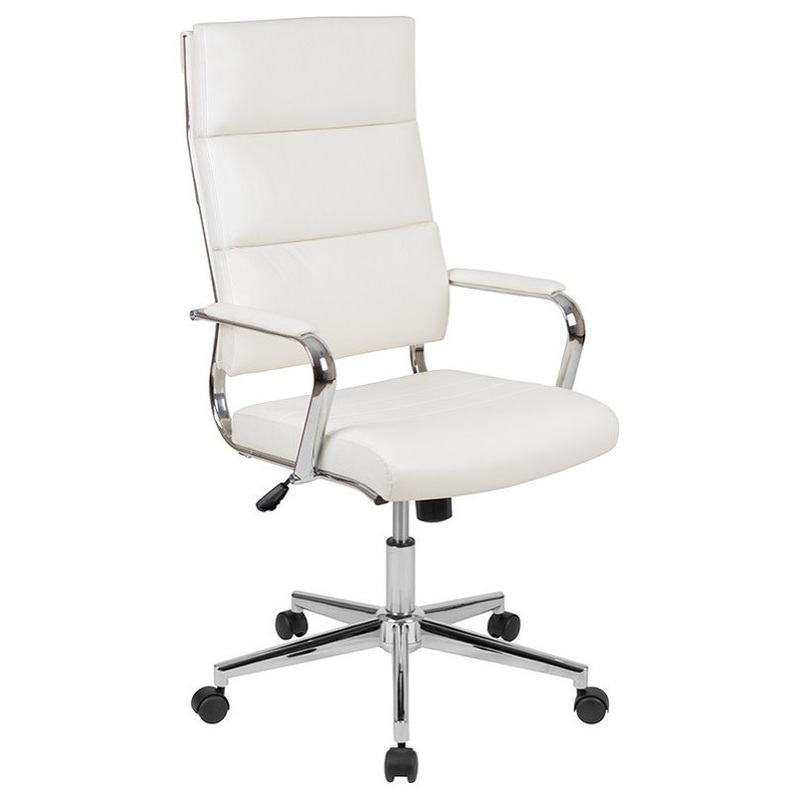 -Modern Executive Office Chair -White LeatherSoft Upholstery -High Back Design with Coat Hanger Bar on Back -Padded Seat with CAL 117 Fire Retardant Foam -Padded Chrome Metal Arms provide support to upper body -Tilt Lock Mechanism rocks/tilts the chair and