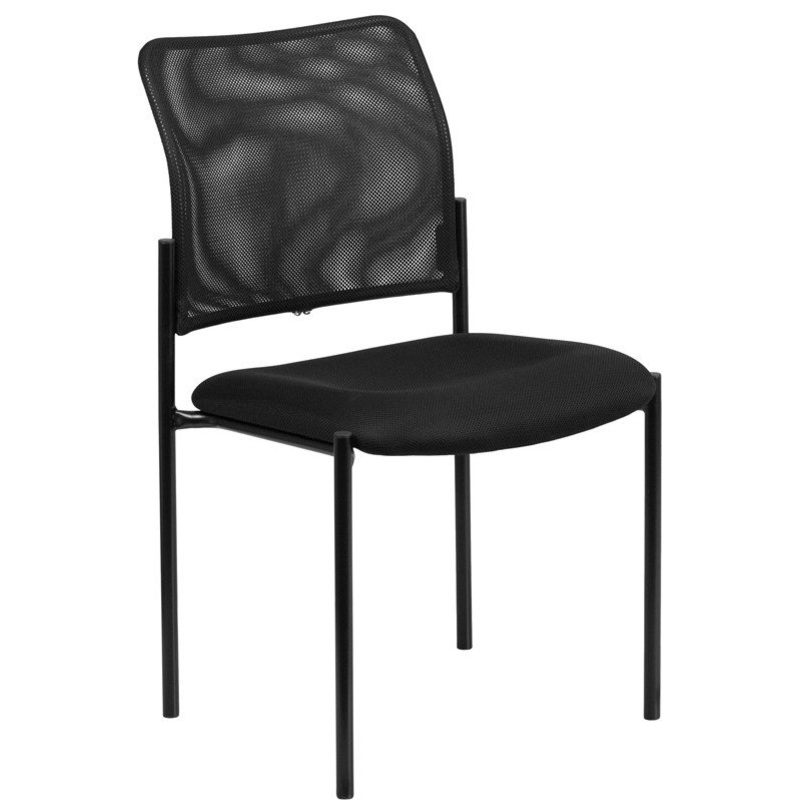 -Contemporary Side Chair -Stack Quantity: 5 -Flexible Red Mesh Back -Built-In Lumbar Support -Contoured Seat Cushion -Padded Black Mesh Upholstered Seat -CAL 117 Fire Retardant Foam -Steel Tubular Frame -Black Powder Coated Frame Finish -Floor Protector Pl