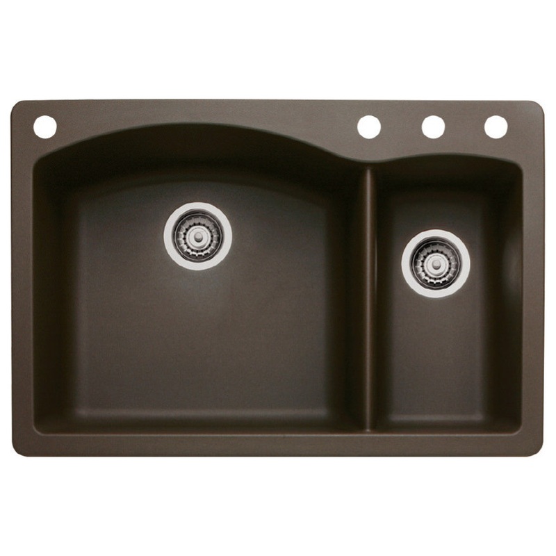 -Diamond 22-in x 33-in Cafe Brown Double-Basin Granite 4-Hole Residential Kitchen Sink -Flat deck is ideal for both drop-in and undermount installations -80% solid granite, Silgranit material features the touch and feel of natural stone -Pre-drilled for 4-