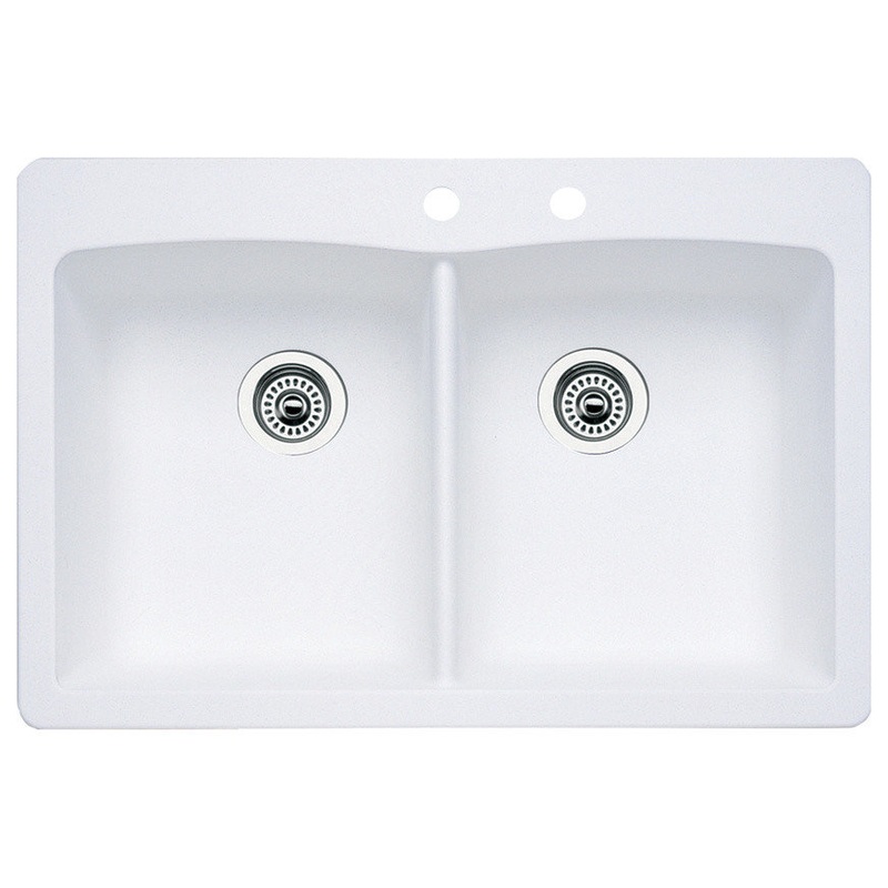 -Diamond 22-in x 33-in White Double-Basin Granite Drop-In or Undermount 2-Hole Residential Kitchen Sink -Flat deck is ideal for both drop-in and undermount installations -80% solid granite, Silgranit material features the touch and feel of natural stone -P