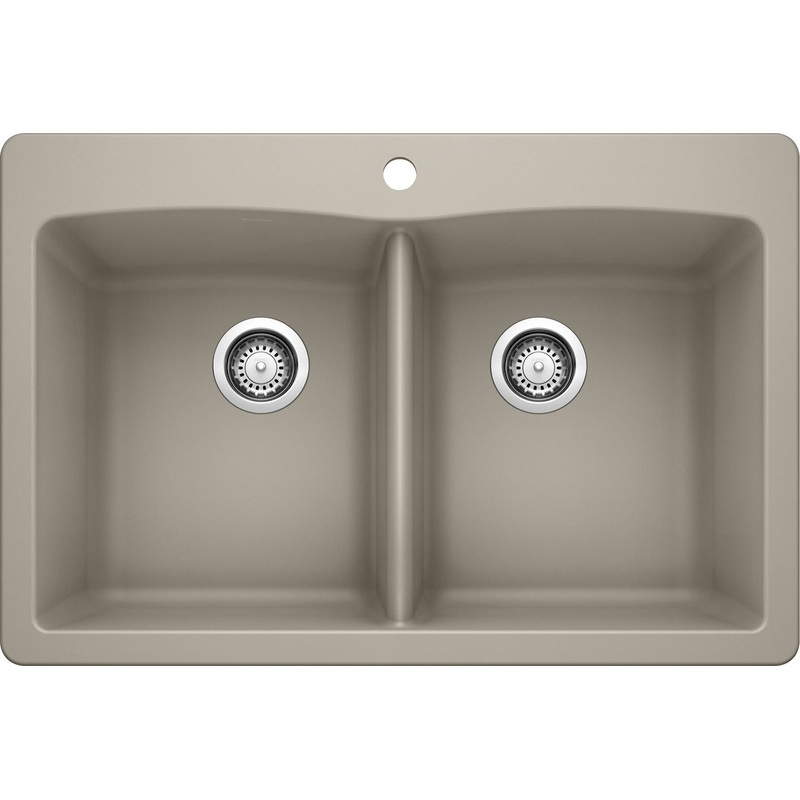 The Blanco Diamond 50/50 double bowl dual mount kitchen sink features a 50/50 bowl design, offering plenty of room for rinsing, washing, soaking, spraying and straining operations. The ideal choice for those who wash dishes by hand, you can stack dirty dishes and utensils in one sick while prepping in the other. This kitchen sink is made of Silgranit, a patented, certified granite composite material that is engineered to take on the toughest kitchen tasks. Beautiful and highly functional with its non-porous, hygienic surface, it pushes away liquids and residue resulting in a low maintenance, easy to clean, long-lasting material. Combine the Diamond double bowl with a Blanco faucet and accessories to create a Blanco unit; a seamless, fully integrated solution designed to transform kitchen chores into joyful experiences. Everything you need to drink, prep and clean, all in one place. Blanco 440221 Features: Silgranit is made of quartz sand, the hardest element of natural granite making it long lasting and durable Easy-to-clean low maintenance material has a non-porous, smooth stone surface Effortlessly remove scuff marks from utensils and stains from food and drinks Versatile dual mount design for drop-in or undermount installation Pre-drilled for single hole faucet with the possibility of 4 additional knock-out holes for accessories Optional accessories include left grid, right grid, and cutting board Basket strainers sold separately Trusted for over 95 years, Blanco sinks are covered by a limited lifetime warranty Blanco 440221 Specifications: Sink Length: 33″ (left to right) Sink Width: 22″ (front to back) Sink Height: 9-1/2″ (top to bottom) Basin Dimensions (Left): 14-1/2″ L x 17″ W x 9-1/2″ D Basin Dimensions (Right): 14-1/2″ L x 17″ W x 9-1/2″ D Faucet Holes: 1 Faucet Hole Size: 1-3/4″ Minimum Cabinet Size: 36″ Drain Connection: 3-1/2″