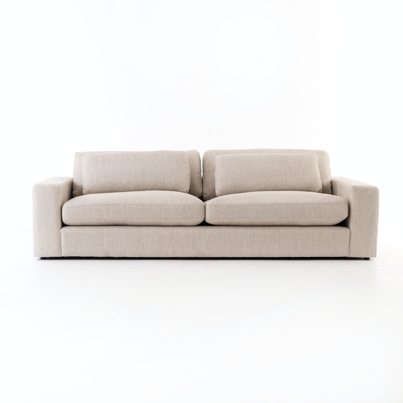 Deep, modern and seductive. This dramatic, spacious sofa is covered in a durable light neutral woven fabric that mixes well with any color palette.