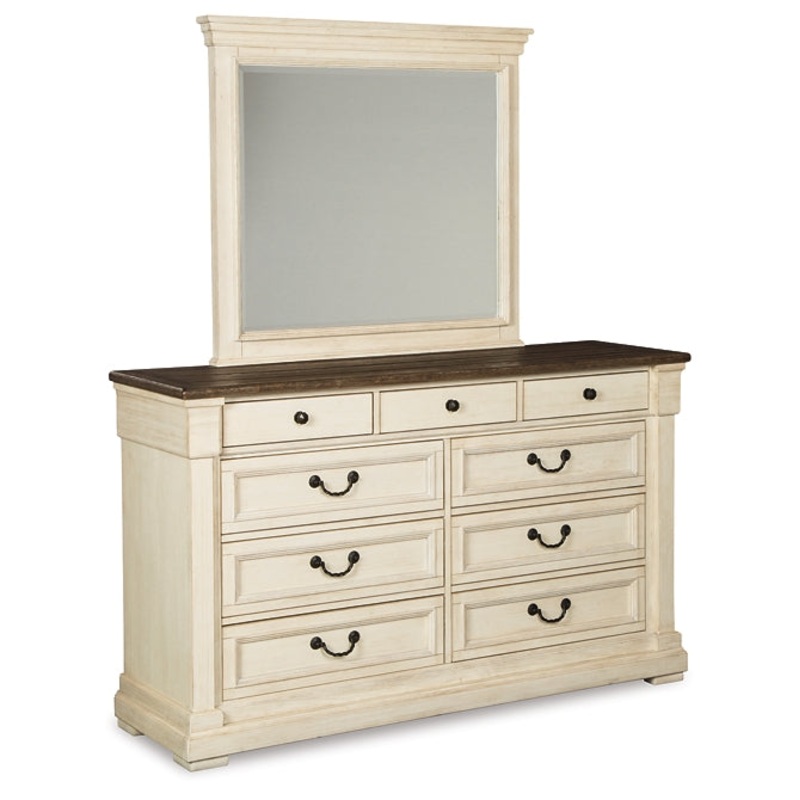 Whether your style is farmhouse fresh, shabby chic or country cottage, youll find this dresser and mirror dressed to impress. Its two-tone, gently distressed finish pairs weathered oak with antique white for that much more quaint character. The dressers nine smooth-gliding drawers are quality crafted with dovetail construction. Three felt-lined top drawers are another reflection of fine detail, inside and out.