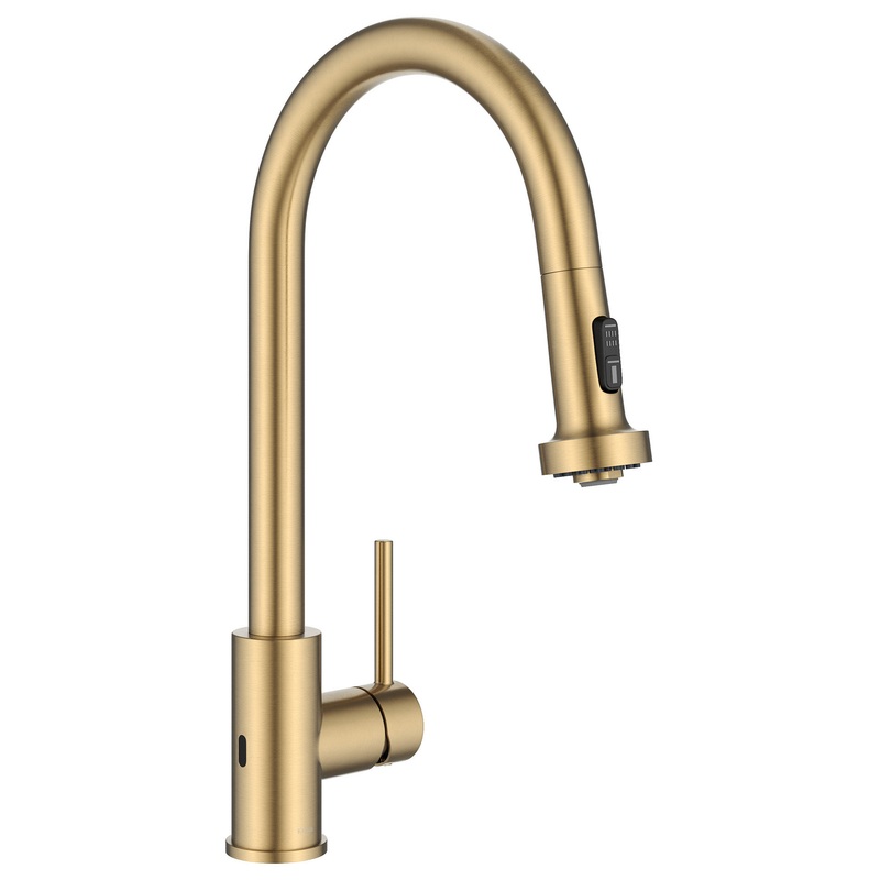-KRAUS Bolden Touchless Sensor 2-Function Single Handle Pull Down Kitchen Faucet in Spot-Free Brushed Brass (KSF-1616BB)Elevate your kitchen with the elegant Bolden Touchless Kitchen Faucet, engineered with motion sensor technology that allows you to turn water on and off with the wave of a hand. Ideal for multitasking, the touchless faucet helps reduce germ transfer during cooking and cleaning. Sensor located on the side helps prevent accidental activation, with built-in timer to reduce water waste. 2-function kitchen faucet with pull down sprayer offers flexibility to reach all around the kitchen sink. ADA-compliant kitchen sink faucet with 90-degree forward handle rotation allows for installation in tight spaces. Comes with pre-attached water lines, control box, batteries and hardware. Wear-resistant finish is not prone to corrosion, with Spot-Free Finish options that resist water spots and fingerprints.