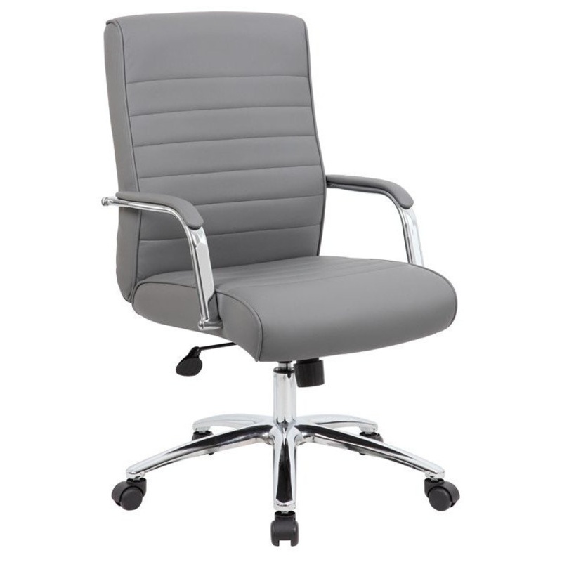 The Modern Executive Conference Chair in ribbed grey is a fine looking chair made with high quality CaressoftPlus vinyl. CaressoftPlus is a trademarked, ultra-soft, breathable upholstery that looks & feels like leather, but more durable & easy to clean. The chair also features a spring tilt mechanism that allows one to change the angle of the entire seat relative to the floor and allows one to transfer some of the upper body weight to the backrest of the chair. In addition to this the chair also boasts a sturdy 27 inch chrome base with 2 inch nylon dual wheel castors and a 275 lbs. weight capacity.