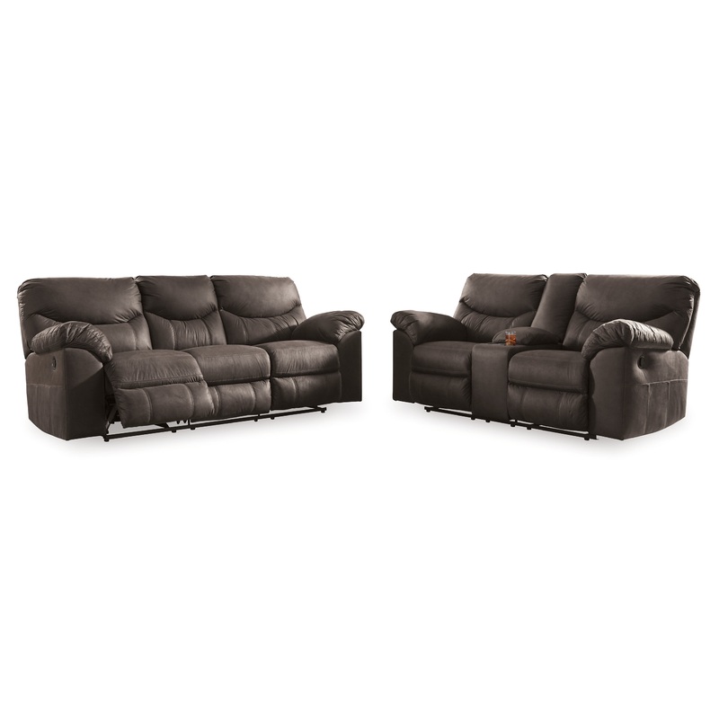 Rock the cool look of leather minus the hefty price tag with this 2-piece reclining living room set. Rich with tonal variation, this setwhich includes a reclining sofa and a double reclining loveseat with consoleis covered in indulgently soft faux leather upholstery that looks like the real thing. And talk about over-the-top comfort. Double stuffed armrests and sumptuous cushions cradle and support in all the right places. Distinctive scooped stitching enhances this reclining sets contemporary flair.