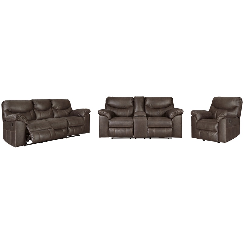 Rock the cool look of leather minus the hefty price tag with this 3-piece reclining living room set. Rich with tonal variation, this setwhich includes a reclining sofa, a double reclining loveseat with console and a rocker reclineris covered in indulgently