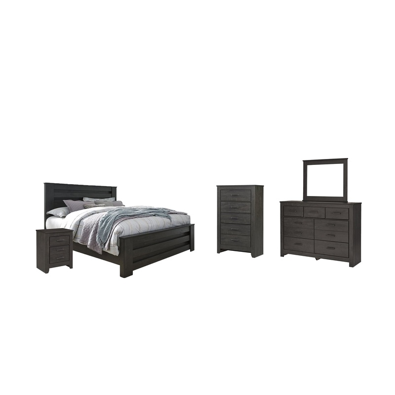 Priced to entice and styled to impress, this 7-piece bedroom set is urban sophistication with a decidedly relaxed air. Its got the crisp, clean lines of a contemporary piece, but with an earthy element. Deep, horizontal grooves infuse depth and dimension, while a replicated oak grain effect gives the charcoal gray finish warmth and character.