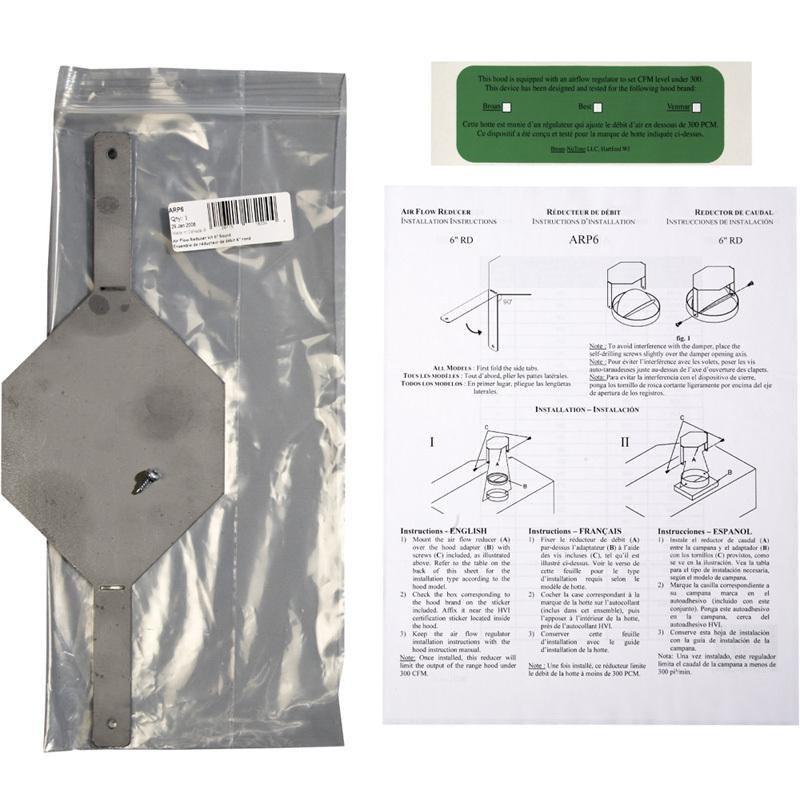 These airflow regulators limit the CFM output of range hoods to comply with most local codes -- and without the need for make-up air. As a result, these kits give access to a broader offering of styles and designs within the standard Broan line of range ho